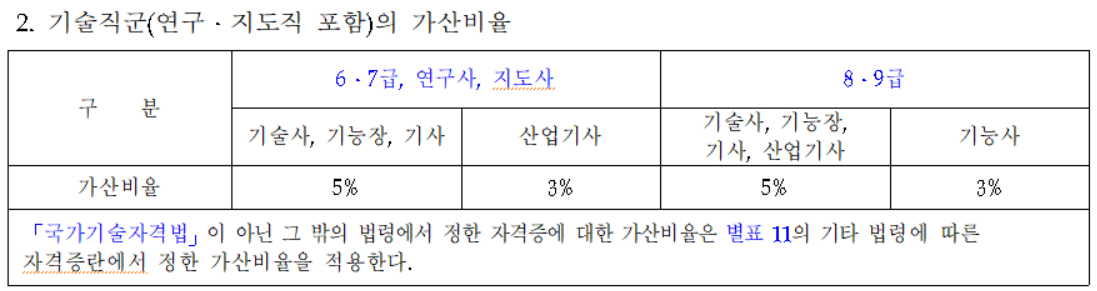 9급 통신직 공무원 준비시 꼭 챙겨야 하는 것이 바로 가산점인데요, 9급 기준으로 아래 표에서 보이는것과 같이, 기술사, 기능장, 기사, 산업기사 자격증이 있으면 5%의 가산점이 추가됩니다! 자격증의 경우는 한개만 인정이 돼기 때문에 보통 5% 가산점인 기술사, 기능장, 기사, 산업기사 자격증을 많이들 취득하십니다.