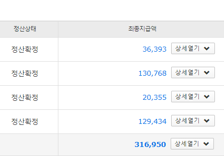 아래 표는 쿠팡 wing 에서 보이는 실제 정산 금액인데요,
