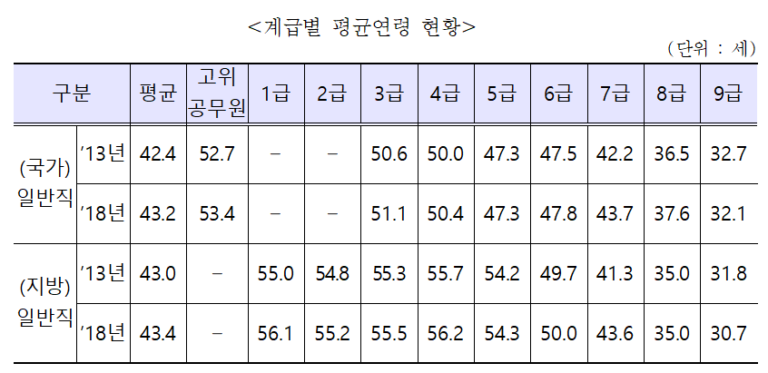 9급에서 7급 진급하는데 소요되는 시간은 국가직, 지방직에 따라 다릅니다. 아래 표는 대한민국 인사혁신처의 공식 보도자료로 각계급별 평균 연령을 나타냅니다. 국가직의 경우는 평균적으로 약 32세, 지방직의 경우는 약 31세에 9급 공무원이 됩니다.