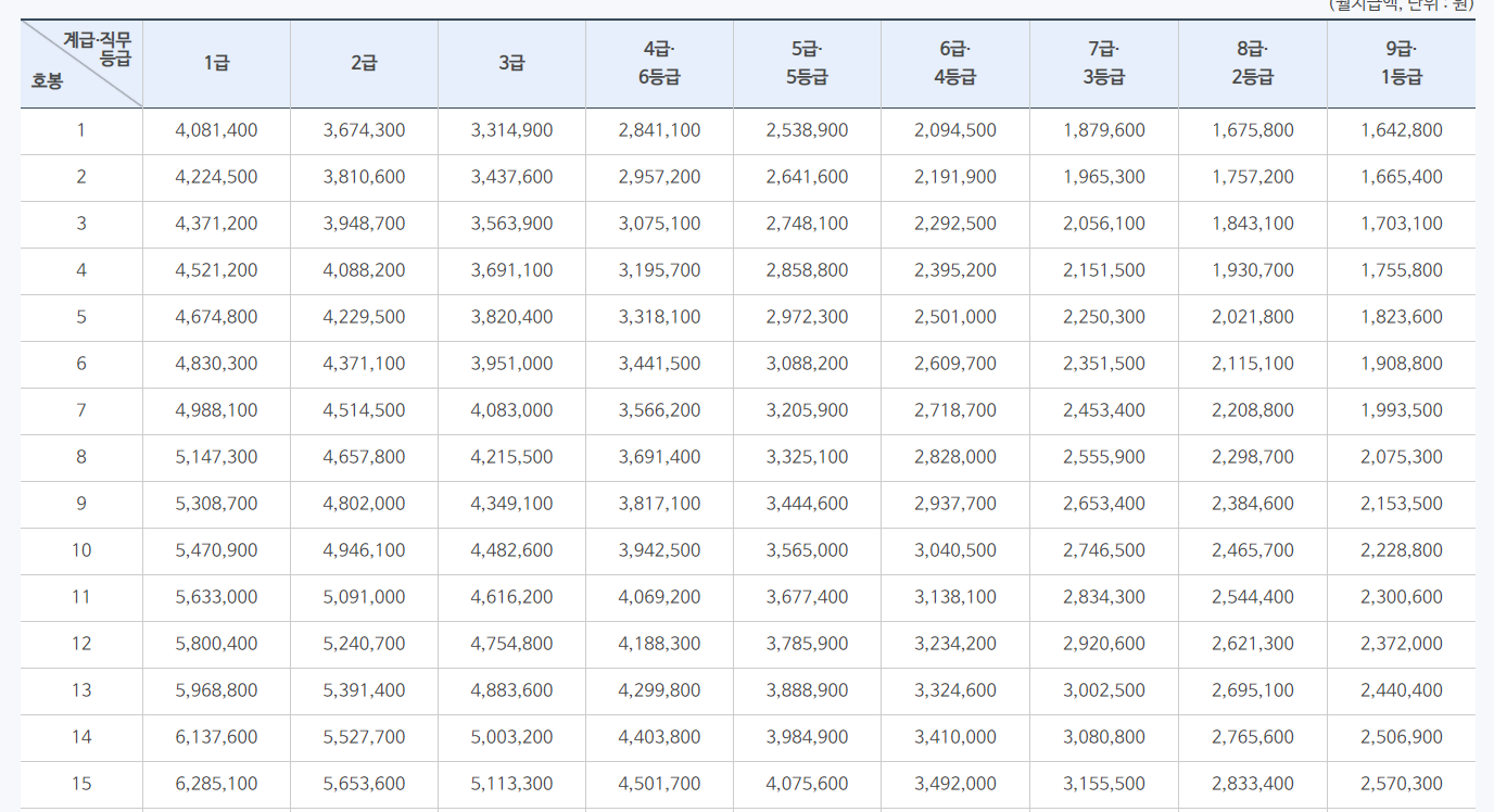 아래 표는 인사혁신처 공식 보도자료인 대한민국 공무원의 계급, 호봉별 월 기본급을 나타낸 표입니다. 7급 초봉의 경우 약 1,879,600원을 수령하며 중간호봉인 15봉의 경우는 3,155,500원, 끝호봉인 31호봉의 경우는 3,941,500원을 받습니다. 하지만 이는 7급 공무원 월급 의 기본값이지, 실수령액 이 아닙니다.
