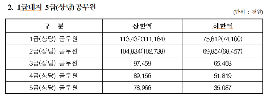 경력직 5급 공무원 (=과장급 사무관)은 "상한액" 에 속하므로, 최대로 연 7천 900만원 정도 수령하며, 5급 고시를 패스해서 들어온신입 5급 공무원은 "하한액"연 3천 500만원 정도 월급을 받습니다.