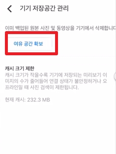 구글포토 > 설정 > 기기저장공간 관리 > 여유공간확보 를 차례로 클릭합니다.