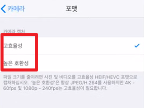 고효율성을 체크해주시면, 사진이 HEIC라는 확장자로 사진이 저장되는데, 흔히쓰는 JPG 사진파일과 동일한 화질을 유지하는데 저장할때 용량이 1/2 밖에 들지 않습니다. 혁신적인 방식이죠?
