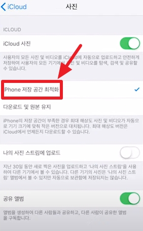 그러면 아래 그림처럼 "iphone 저장공간 최적화" 라는 항목이 있습니다. 이것을 체크줍니다. 해당기능이 바로 용량 부족시 사진이 icloud로 자동으로 업로드 되고 기기에는 최적화질로 용량을 다운그레이드 시켜서 저장시켜주는 기능입니다. 아이폰 사진 용량 줄이기 도 하고, 원본 사진도 킵할 수 있으니 1석 2조의 기능이죠.