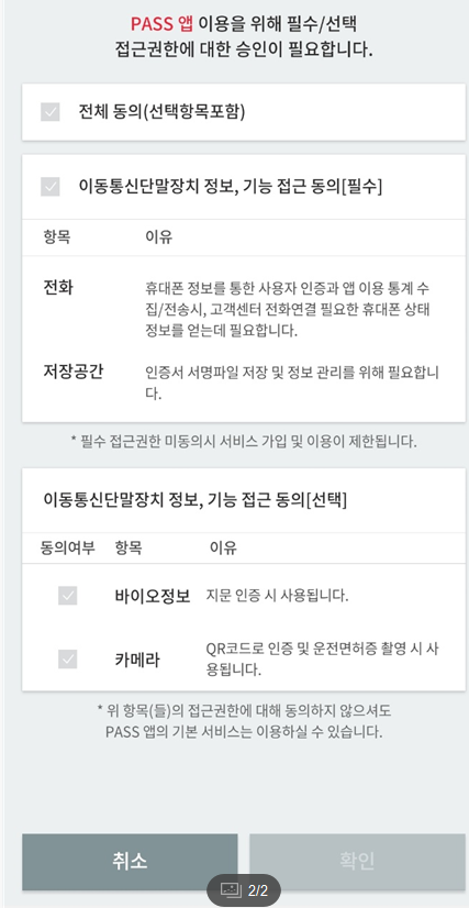 Pass 앱 다운로드 후 열기를 누르면 아래그림처럼 동의할 항목들이 나옵니다. 전체동의를 누르고 다음으로 넘어가 줍니다.