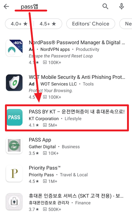 운전면허증을 핸드폰에 등록하려면 패스앱 을 일단 다운 받아줘야 합니다. Play store에 들어가셔서 아래그림처럼 Pass 앱 을 검색합니다. PASS BY KT - 운전면허증이 내 휴대폰속으로! 를 다운받습니다.