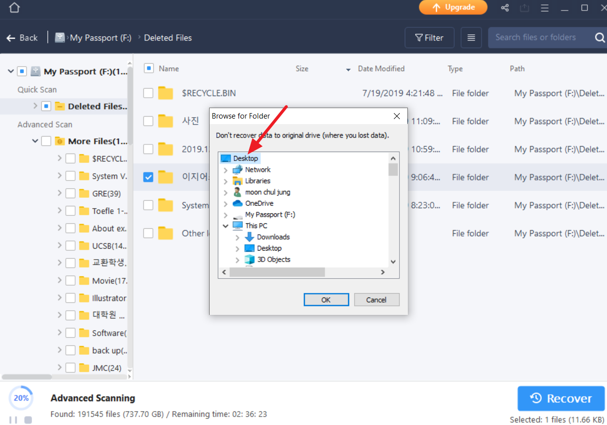 그러면 아래그림처럼 파일 복원위치를 선택하는 창이 나타납니다. 저는 간편하게 desktop 으로 지정하고 복원을 해줬습니다.