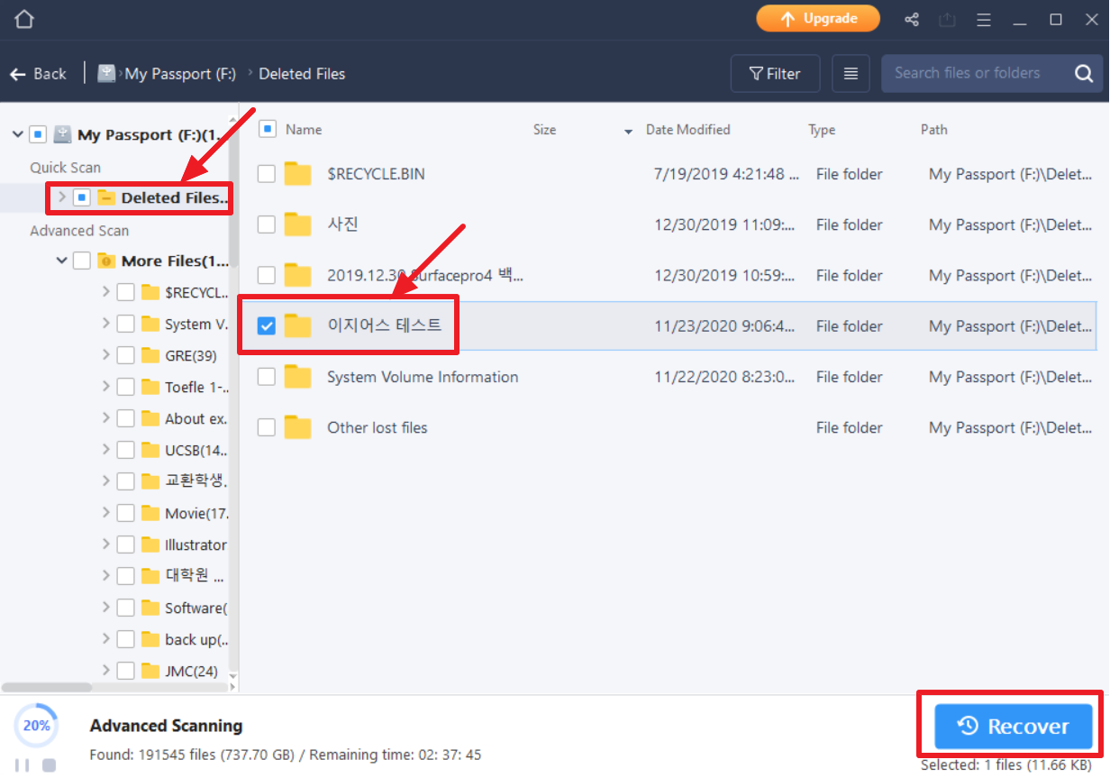 그러면 파일복구 프로그램 이 자동으로 외장하드를 스캔하고 아래 그림처럼 Deleted files (삭제된 파일) 을 클릭하면 우리가 방금전에 외장하드에서 삭제했던 "이지어스 테스트" 라는 삭제된 파일이 목록에 뜨게 됩니다. 이제 "Recover(복구)"버튼을 눌러 영구삭제 복구 를 해줍니다.