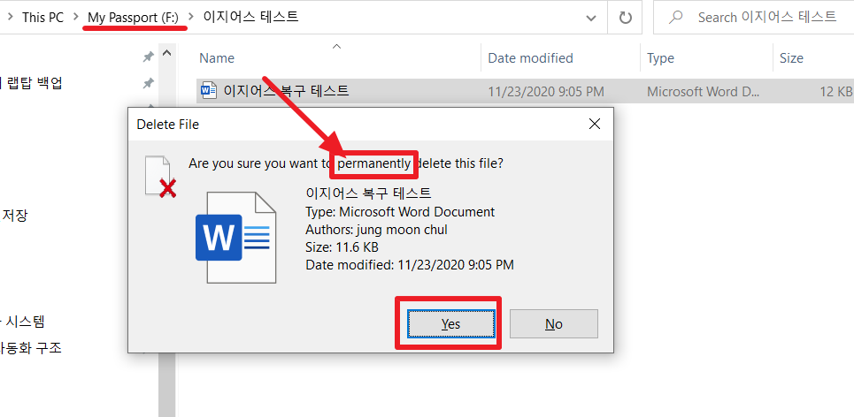 이지어스 로 영구삭제 복구 테스트를 해봅시다. 외장하드에 사진파일이든, 워드파일이든 테스트 샘플을 만들어 Shft+delete를 눌러서 영구삭제를 해줍시다. 그냥 delete를 누르면 휴지통으로 삭제가 되므로 꼭 Shift+delete를 눌러서 영구 삭제해주세요. 저는 아래 그림처럼 My passport라는 제 외장하드에 "이지어스 복구테스트"라는 워드파일을 만들었고 영구삭제 해보았습니다.