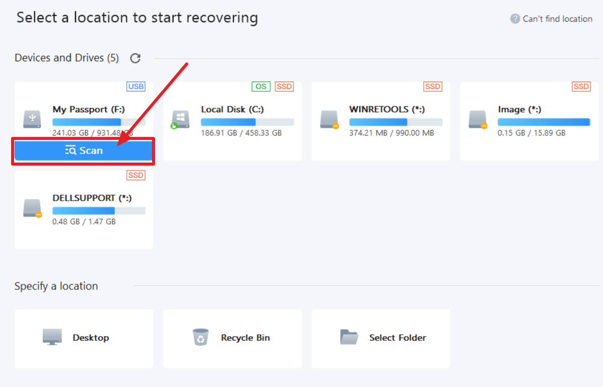 영구삭제가 되었다면 이 상태에서 이지어스 를 실행합니다. 그러면 현재 구동중인 모든 저장 드라이브를 보여줍니다. 더불어서, 무엇이 USB인지, 어떤 드라이브에 OS 설치가 되어 있는지, SDD, HDD 여부를 확인할 수 있습니다. 우리는 외장하드에서 파일을 삭제했으므로 아래그림처럼 My passport (F:) 에 마우스를 올려 Scan(스캔) 을 클릭합니다.