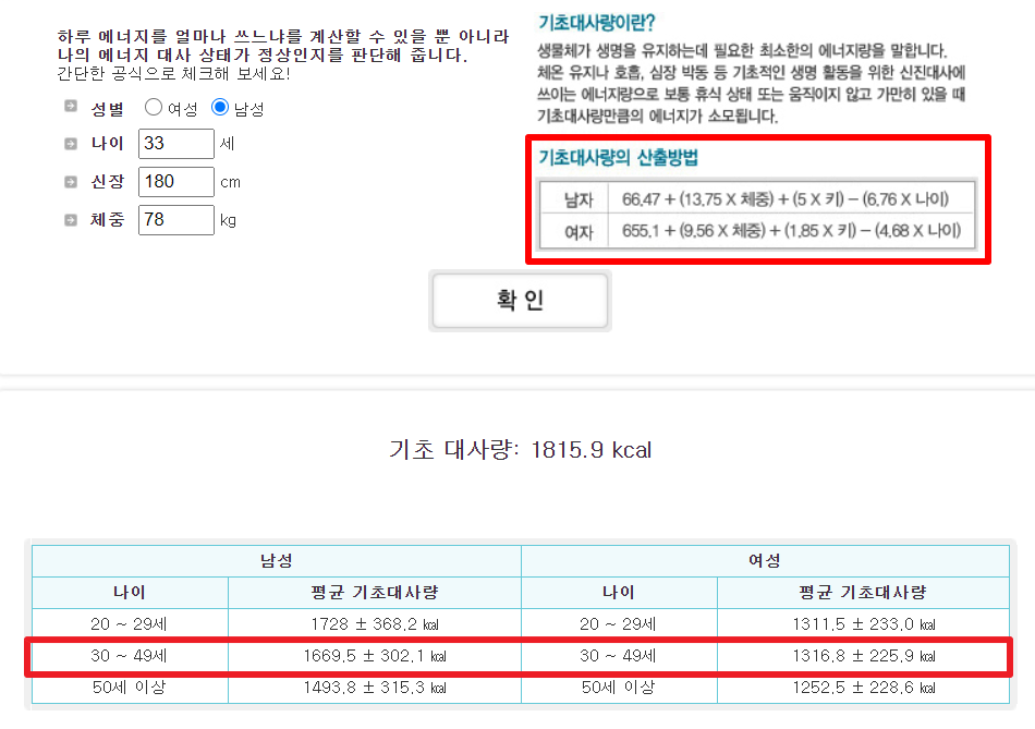 저는 33세, 남성, 180cm 78kg 기준으로 기초대사량 계산 해보니 1815kcal 가 나왔네요! 이 사이트에서는 내 기초대사량 계산이 가능한 것 뿐만 아니라 평균적인 나이별, 성별 기초대사량을 적어두고 있습니다. 제 나이구간 30-49세 남성의 평균 기초대사량이 1315kcal 인걸 보면 저는 기초대사량이 높은 편이네요! (아싸 음식 더 먹을수있다)
