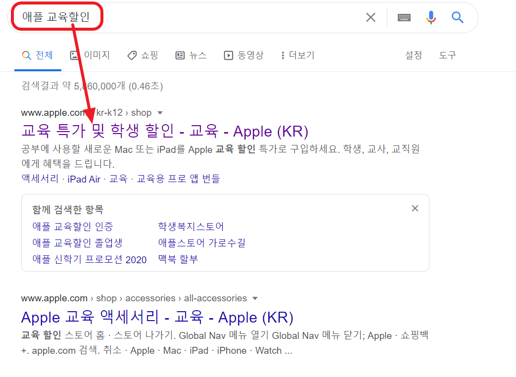 애플교육할인 받는 방법은 간단합니다. 아래 그림처럼 검색창에 "애플교육할인" 이라고 검색후 첫번째 트는 애플 공식페이지에 접속합니다.