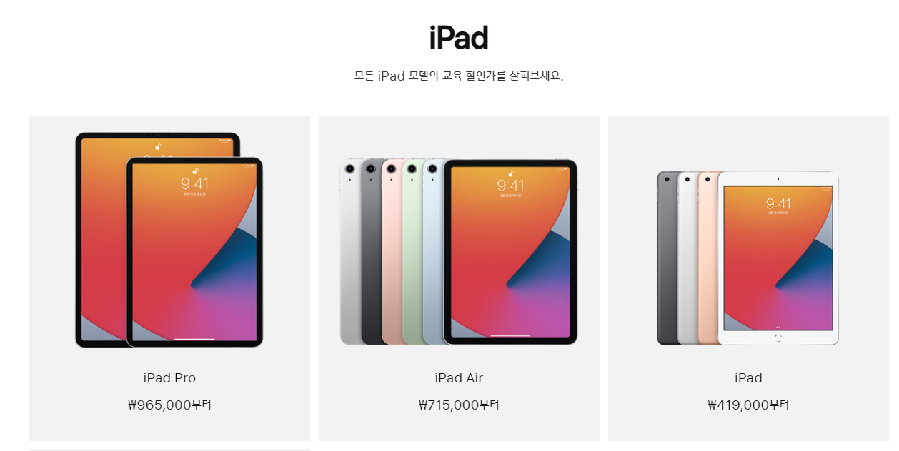 그뿐만 아니라 아이패드 제품에도 할인혜택을 받을 수 있는데요, 아이패드 에어, 아이패드 프로 역시 교육할인 대상 제품입니다.