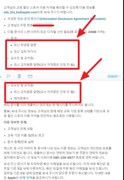 해당 서류를 edu_bto_ko@apple.com 으로 보내면 맥북프로교육할인 이 완료 됩니다. 만약에, 언급된 서류를 제출하지 않으면, 주문은 했더라도 완료가 되지 않고 자동으로 "취소"가 되기 때문에 유의하시기 바랍니다. 그리고, "정보 공개 동의서" 문서도 함께 메일로 딸려오는데요 Print해서 도장 또는 서명을 하고 스캔해서 같이 보내줘야 합니다.