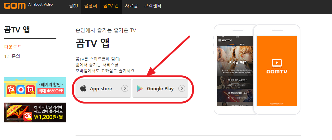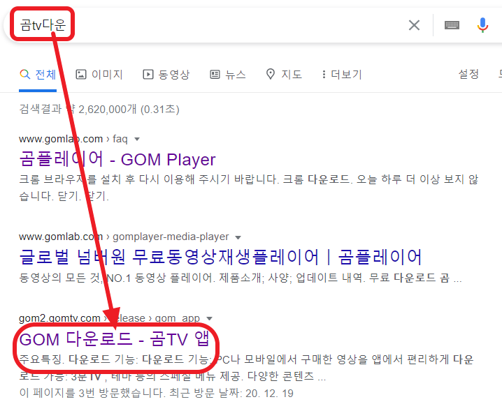 3번째 웹사이트인 Gom 다운로드-곰TV 앱 을 클릭합니다.