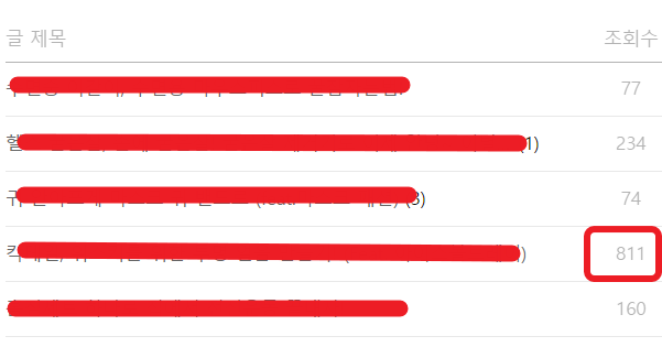 위 그림은 제가 운영하는 블로그의 글 당 조회수를 캡쳐한 모습입니다. 블로그에 쿠팡 제품에 대한 홍보글 또는 소개글을 써서 유입하게 만드는 것이죠. 위에서 보면 아시겠지만 유난히 한 글이 조회수가 800회 이상으로 다른 글에 비해 훨씬더 많습니다.