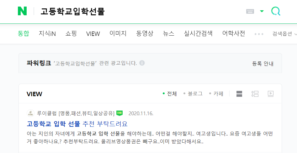 쿠팡 파트너스 지식인 을 하는 방법은 정말 간단합니다. 지식인 카테고리가 N 사의 상위 노출 되는 검색어를 찾고, 그 검색어에 맞는 질문 및 답변을 작성하여 고객을 유도하는 것입니다. 아래 예시를 들어보겠습니다. "고등학교입학선물"이라고 검색하면 지식in 이 2번째로 노출됩니다.