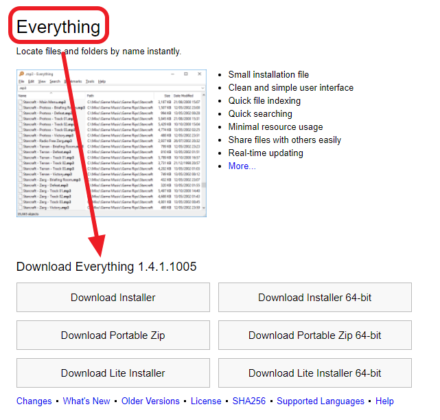 그럼 아래그림처럼 에브리띵이라는 게 뜨죠? 별볼일없는것처럼 보이지만 굉장히 강력한툴이에요. 본인 컴퓨터 사양에 맞게 다운로드 받아주세요. 저는 64피트여서 이걸 다운받았습니다.