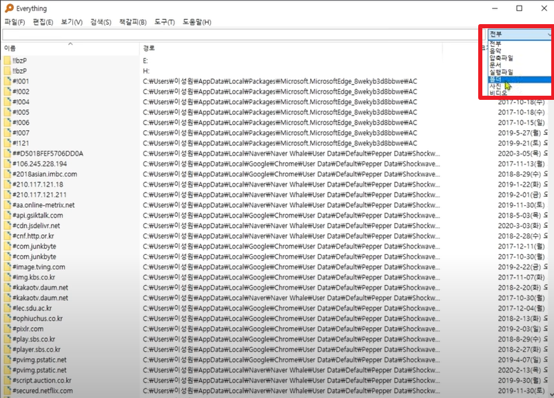 이제, 오른쪽 상단의 필터를 통해서 찾고자 하는 파일 형식을 선택해줍니다. 예를들면, "폴더"를 찾고싶다 하면 그걸 눌러주고요, 음악파일을 찾고싶다하면 음악파일을 눌러줍니다. 제가 파일관리 프로그램 을 사용하면서 가장 많이 사용하는 기능은 폴더찾기에요.